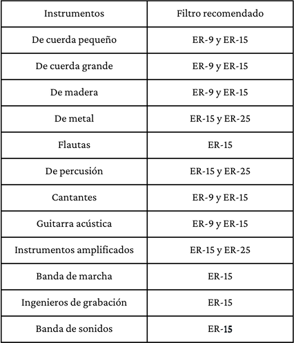 Los tapones para músicos atenúan todas las frecuencias, proporcionando una música más clara y natural. Disponibles en tres filtros: ER-9 (corte en 9 dB), ER-15 (corte en 15 dB) y ER-25 (corte en 25 dB).